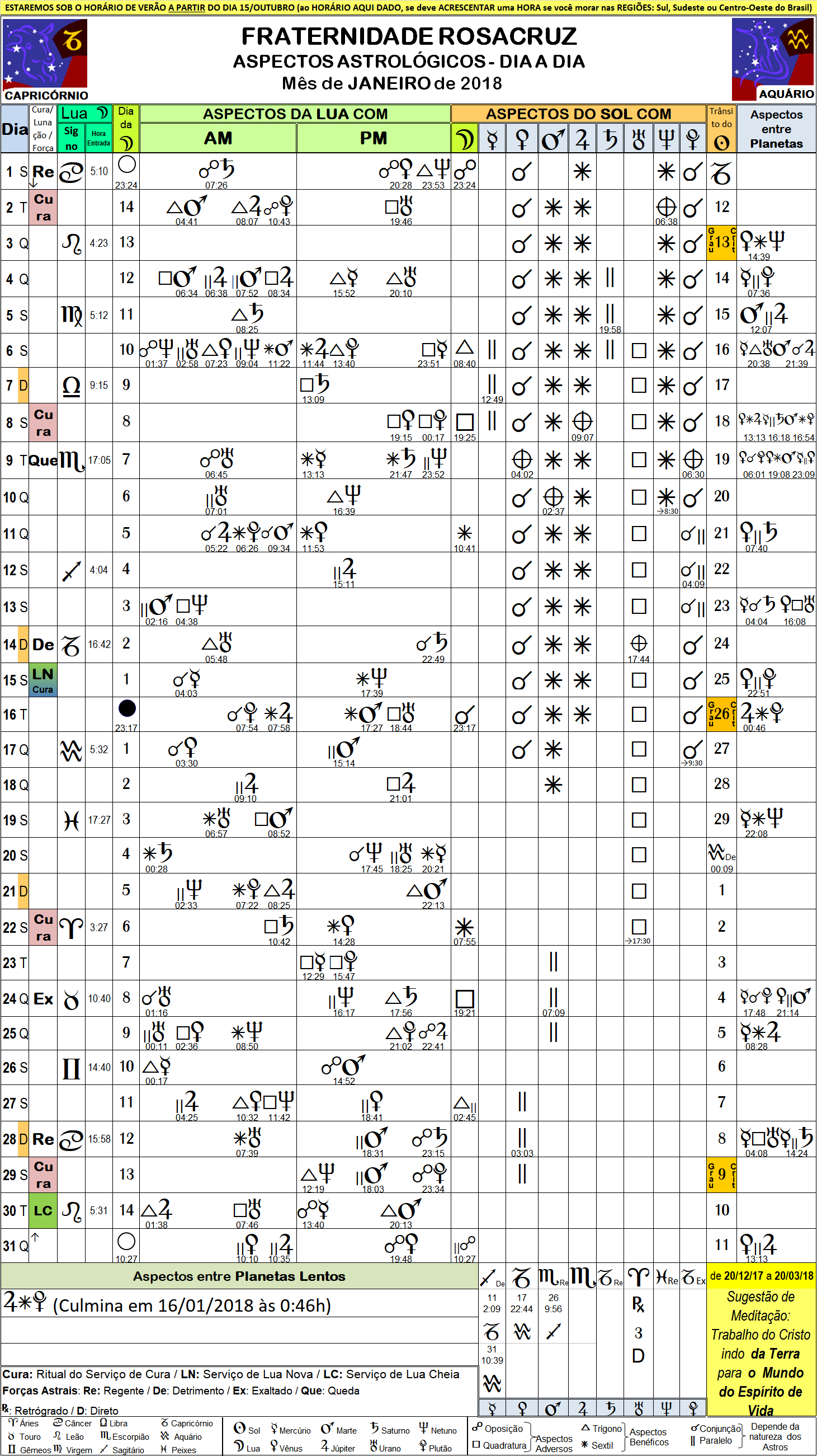 01_18 – Folha com Aspectos Astrológicos Rosacruz – Janeiro de 2018