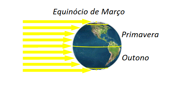 Assim, todos os anos quando o Sol cruza a linha do equador indo do hemisfério sul para o hemisfério norte temos o Equinócio de Março (ou de Outono), para nós do hemisfério sul, o início da estação do outono. Isso ocorre todos os anos, em torno do dia 21 ou 22 de março. Já para o hemisfério norte é o Equinócio de (ou da Primavera), o início da estação da primavera.